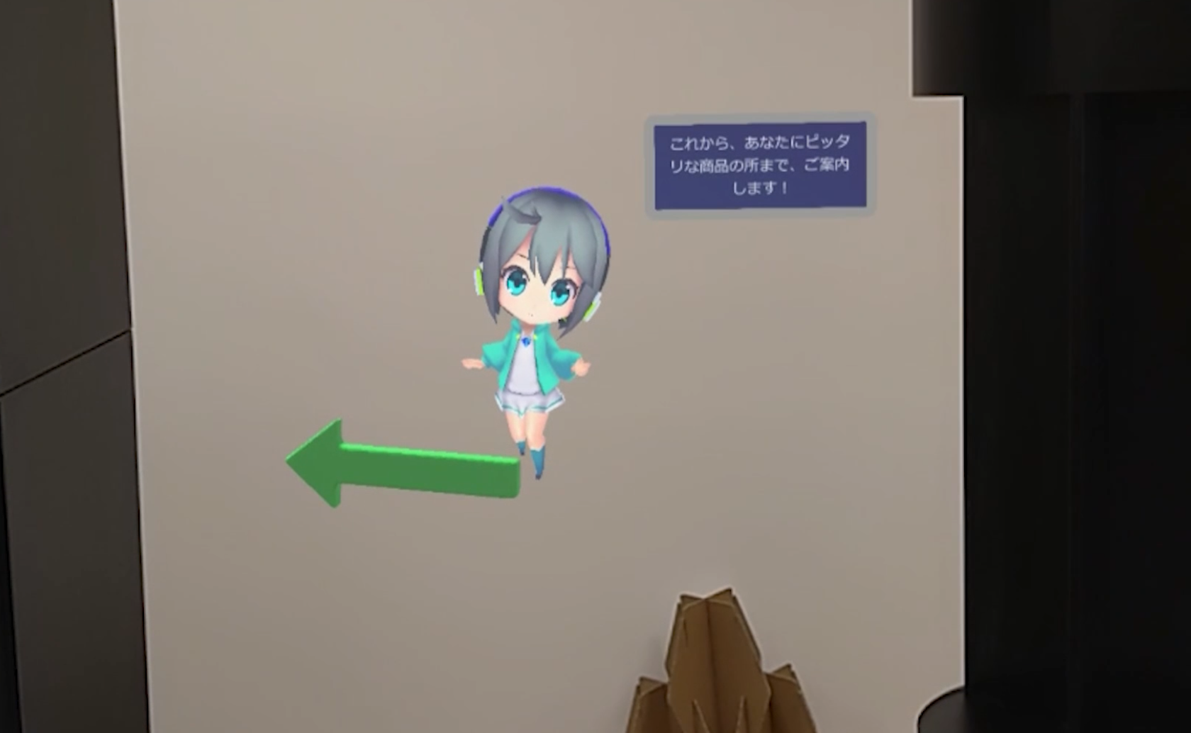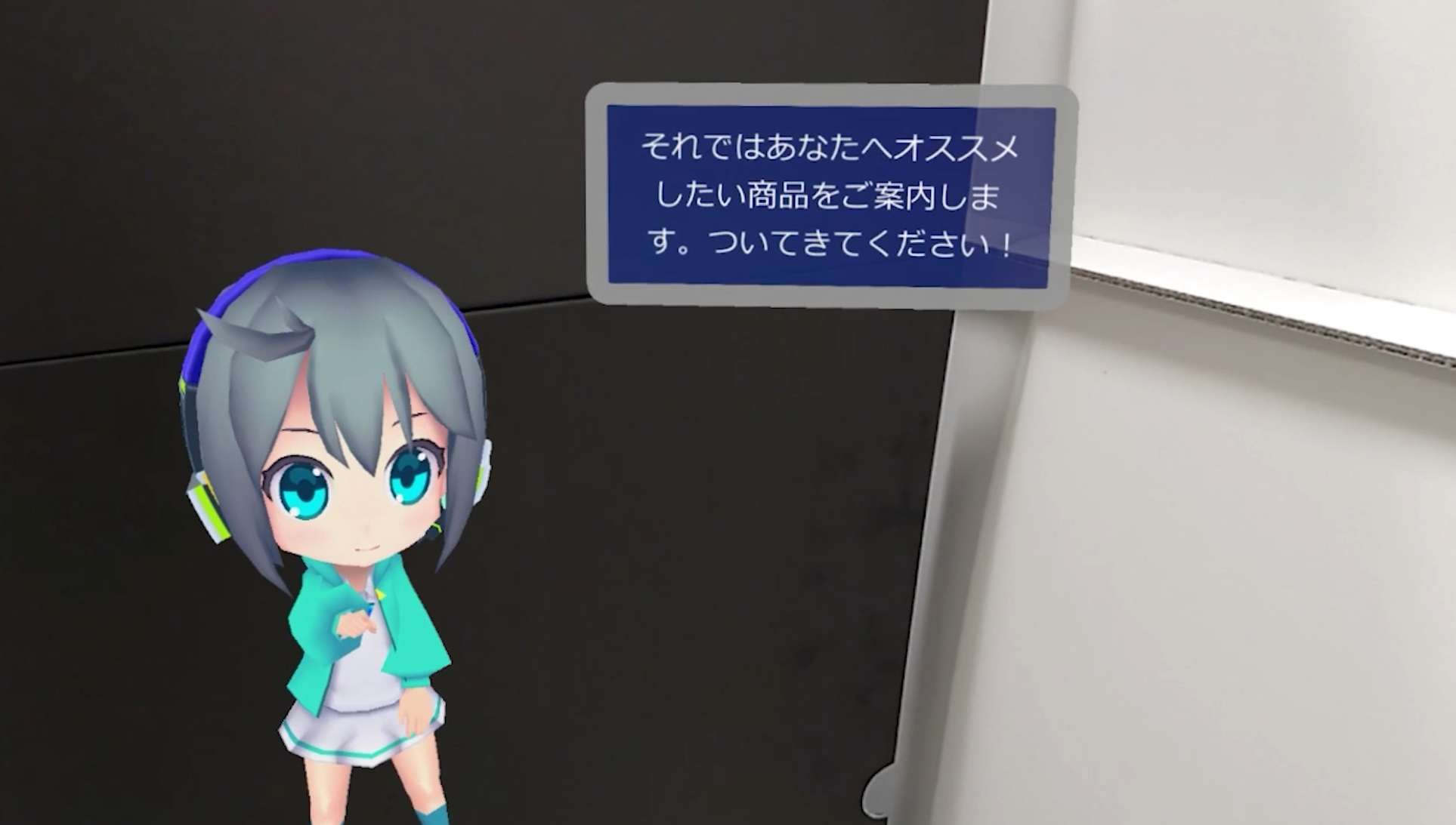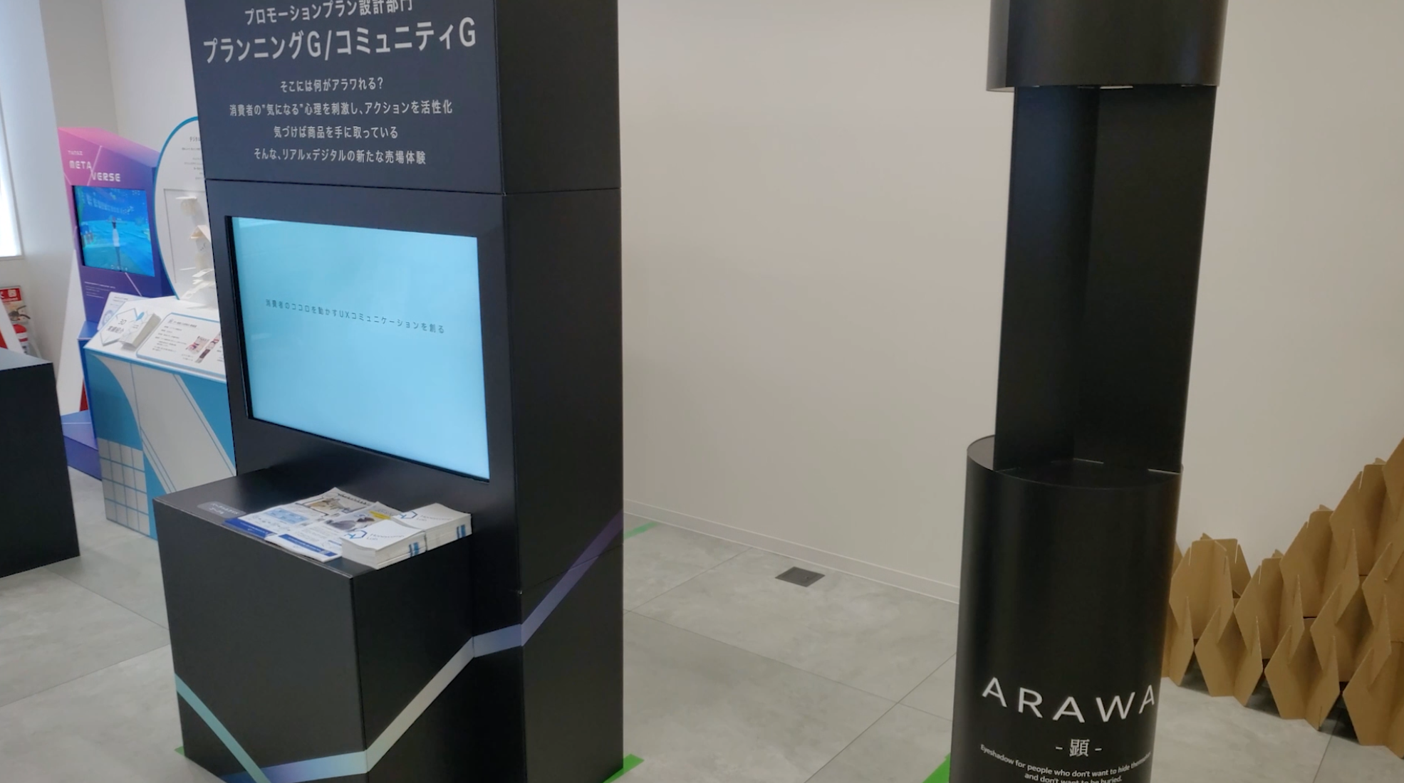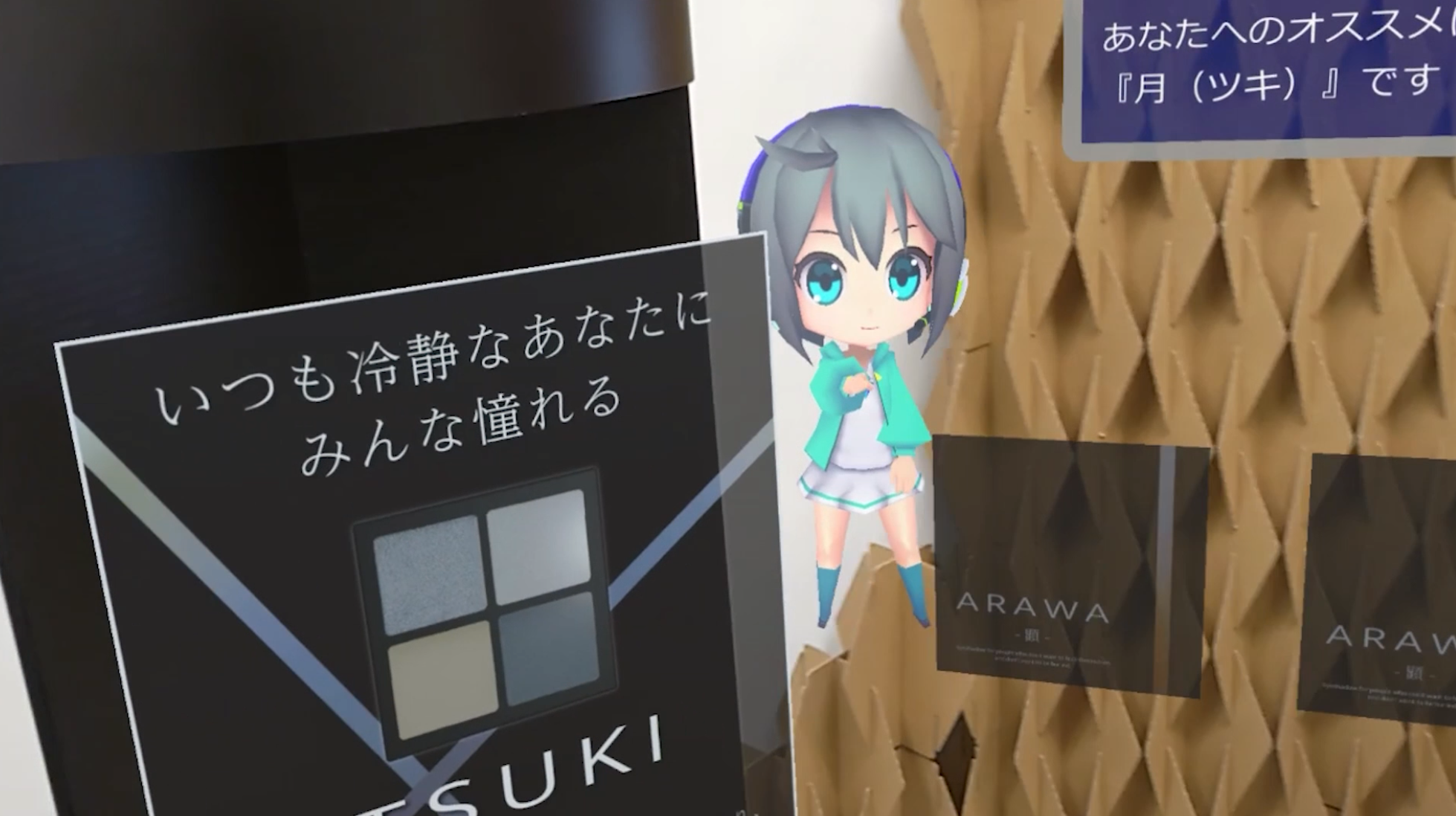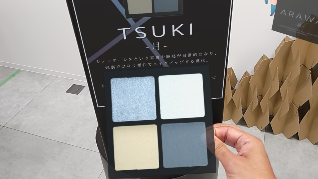 本イベントは化粧品などの販促やその仕組みの展示を行うイベントで、その1コーナーにおいてバーチャルガイドXRを利用した販促体験を展示。現実空間とバーチャル空間を融合させ、商品動画の閲覧や体験者への質問を通じて、その人におすすめの商品を提案、展示場所に空間内を案内するコンテンツです。実物の商品は展示せず、商品の3Dモデルを利用したバーチャル展示となっており、その人に応じた商品の出し分けを容易にすることができる仕掛けです。