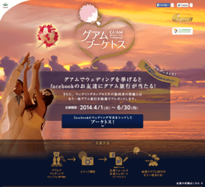グアム政府観光局 2014/04/01 キャンペーン期間中にグアムでウェディングをあげたカップルとその参列者(facebook上の友人)に、抽選でグアム旅行があたる「グアムブーケトスキャンペーン」に伴い、キャンペーンサイトの管理画面と動的画面の組み込みを担当しました。