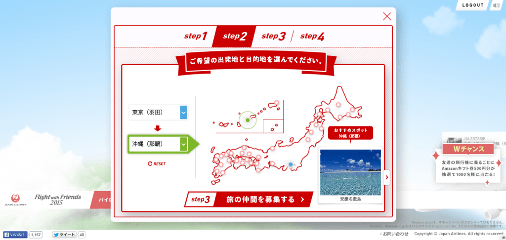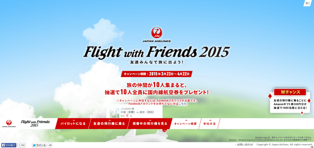 10名をFacebookで集めることでプレゼントキャンペーンに応募することができ、その中から抽選で選ばれた旅客機のパイロット/乗客全員に、JALの国内線往復航空券がプレゼントされるキャンペーンで、今回は搭乗する際にインスタントウィンと呼ばれるその場でAmazonGiftCardが当たる機能も追加されました。