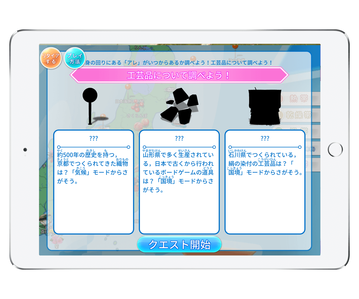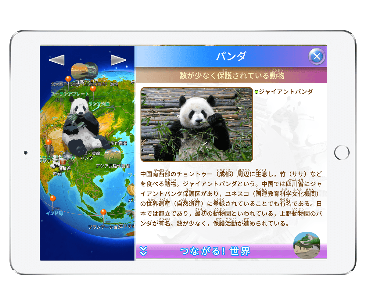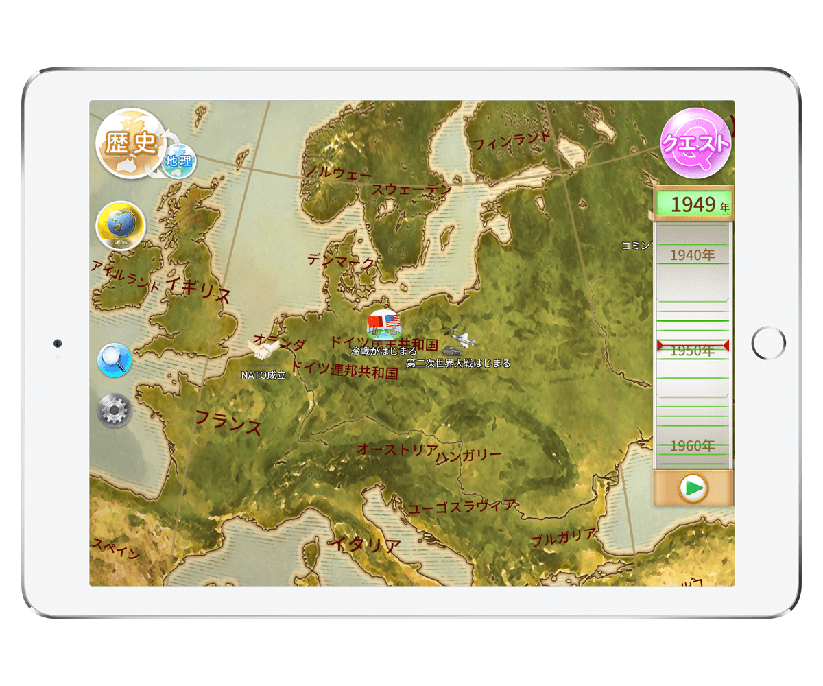 拡大縮小・回転など自由に動かせる地球儀の上で、子ども達の好奇心をそそる様々なミッションに挑戦。精霊ジンと共に世界の謎を解くストーリーモードなど、 ゲーム性にあふれる体験を通じ、「暗記」ではなく「記憶」させる演出と美しいグラフィックで効果的に楽しみながら学習! 小学3年〜高校3年までの地理と歴史の勉強を楽しくサポートします。