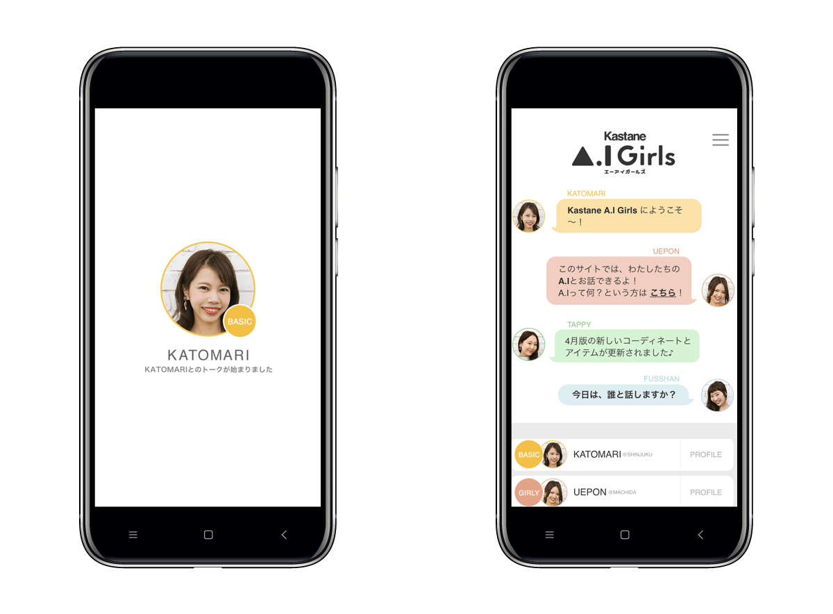 株式会社パル 2016/02/12 - 2016/05/10 http://www.kastane.com/aigirls/lp/ ファッションブランド「Kastane」の人気ショップスタッフ4名がA.I.(人工知能)となって登場。ユーザーとの会話をもとにコーディネートを提案する”新しい自分スタイルを発見するお手伝い”を目指した、スマートフォン用キャンペーンWebサイト。A.I.との日常会話を楽しみながら、提案されたアイテムやコーディネートはそのままECサイトへと繋がり、その場で購入可能です。