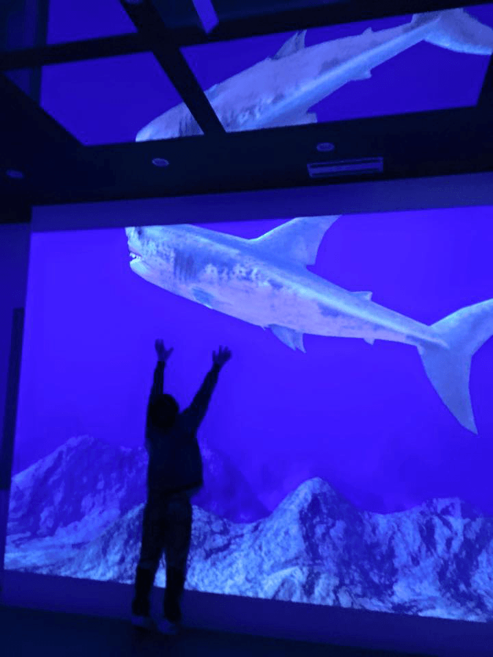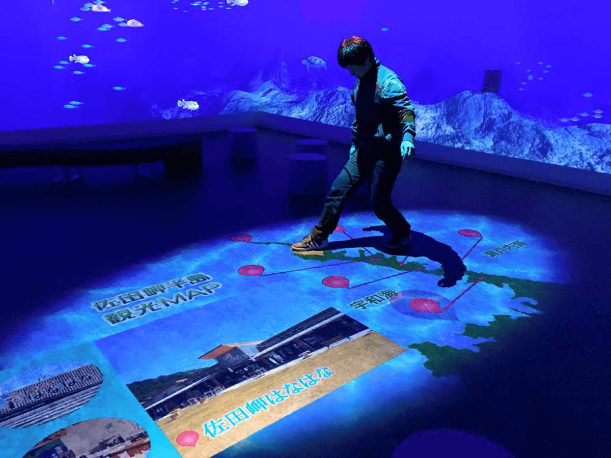 10種類の魚がぐるりと泳ぐ大迫力の水族館は、魚を手で触れることで魚が逃げたりこっちを向いたり、様々なアクションを楽しむことができ、床面投影のコンテンツには付近の観光スポットの候補が地図とともに表示されており、それぞれのポイントを足で踏むことで各紹介映像が流れる仕組みになっています。