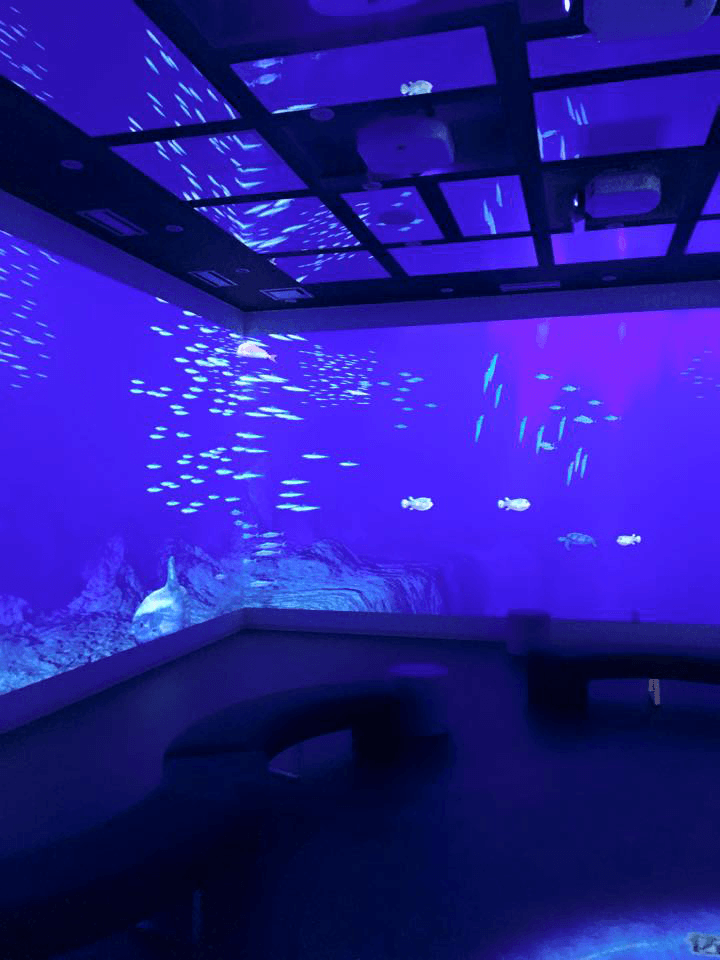 愛媛県伊方町 2016/04/02 https://www.town.ikata.ehime.jp/soshiki/25/91.html 愛媛県伊方町の道の駅「きらら館」。その2階部分の8m x 8m x 3.5mの空間を巨大なバーチャル水族館にフルリニューアルしました。プロジェクター8台とKinect2 8台を用いて、壁面4方向と床面にインタラクティブなプロジェクションコンテンツを実現。企画・設計・開発全般を担当しました。