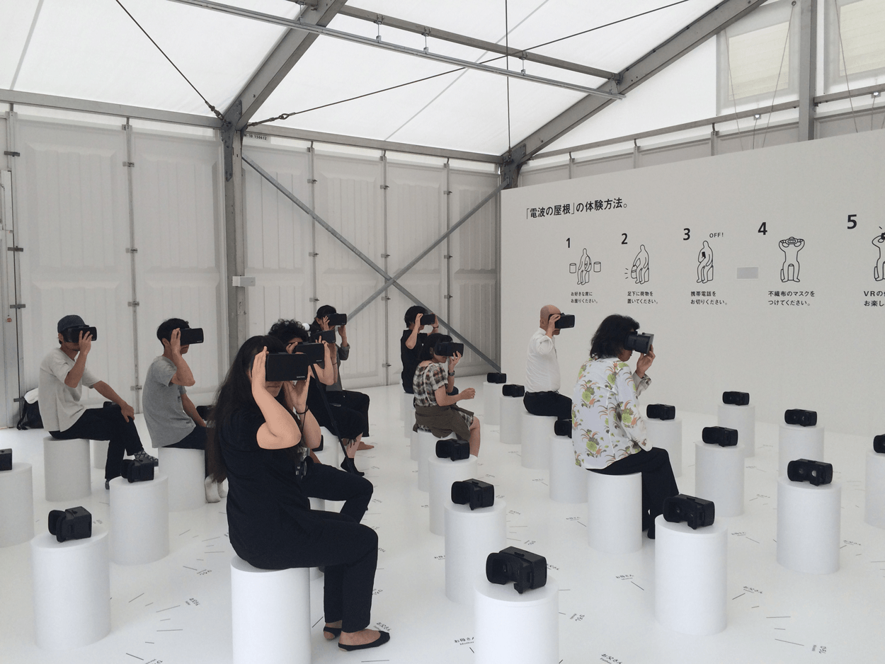 今回の体験展示は、建築としての家ではなくスマホ端末が作る「家族という連携」を体感できる場となりました。空間設計は原研哉氏。パビリオン内では鬼才・中島信也氏の映像作品を30台以上のスマートフォン端末を使ったVR(バーチャル・リアリティ)を通じてたくさんの人が同時に体験できる仕掛けを作りました。