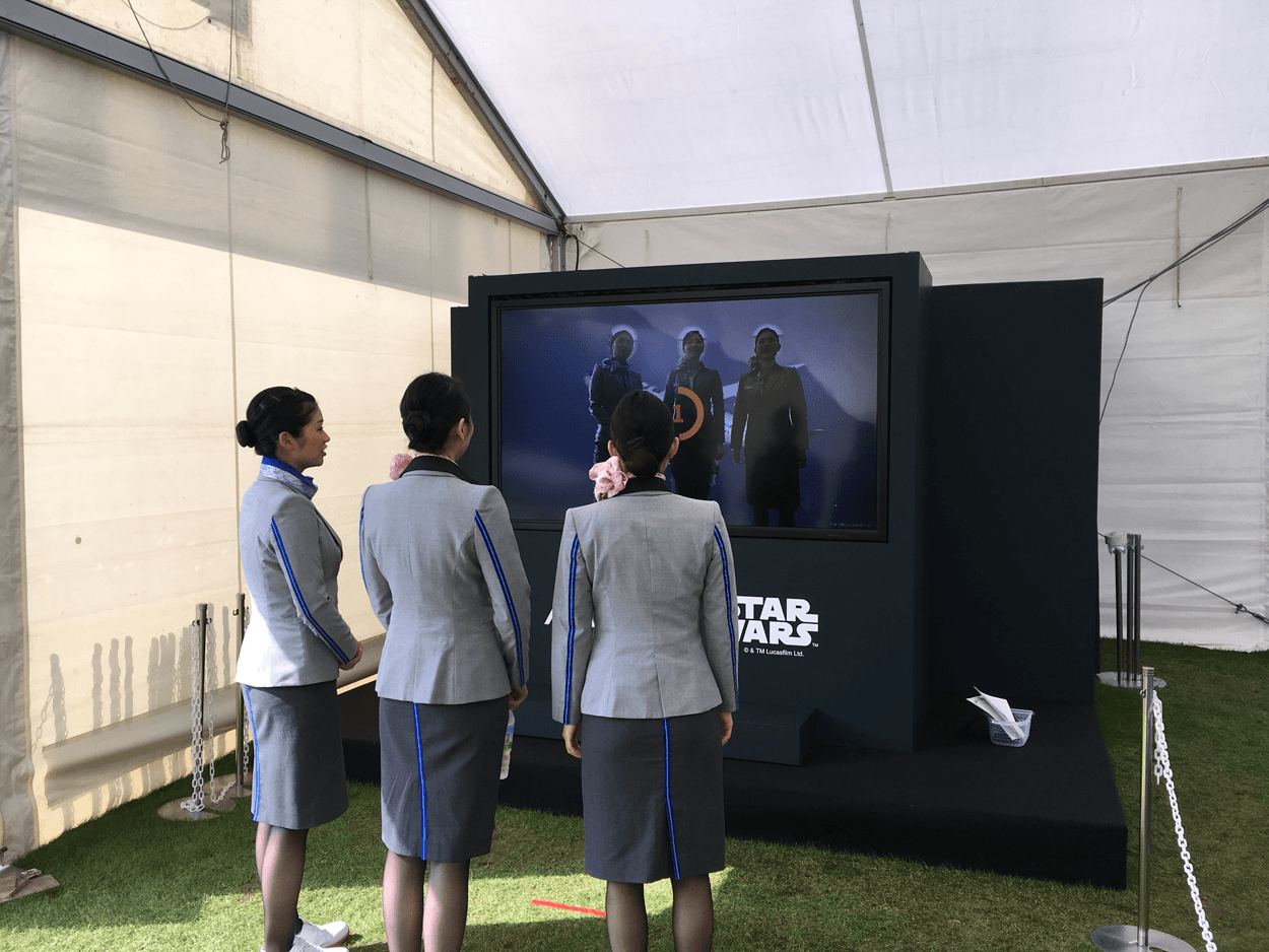 モニターの前に立つと自分の姿がモニターの中に映し出されます。もくもくと画面いっぱいに出た雲を体全体でかき分けると、そこにはスペシャルデザインで運行中のANAスターウォーズジェットが出現。面白いポーズで飛行機と一緒に写真を撮れます。