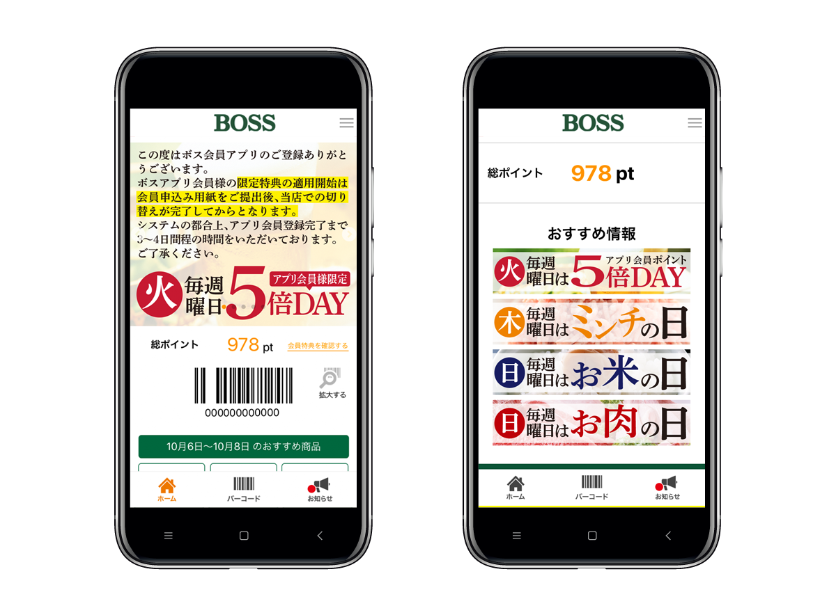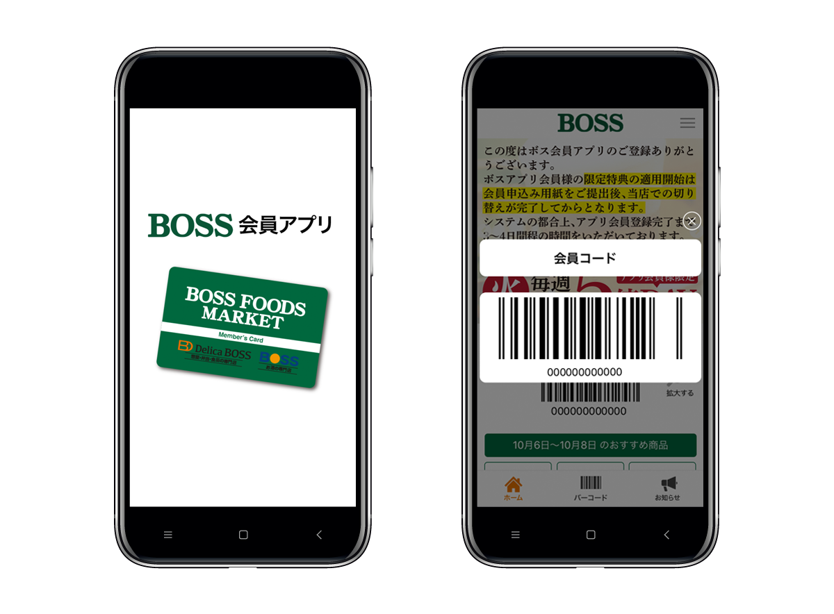 MANPOW FOODS SERVICE 2020/07/01 MANPOW FOODS SERVICEが運営するデリカボス(BOSS FOODS MARKET)、酒のボス(BOSS本店、BOSS三福寺、BOSS古川店)の会員様専用の iOS / Androidアプリを開発しました。